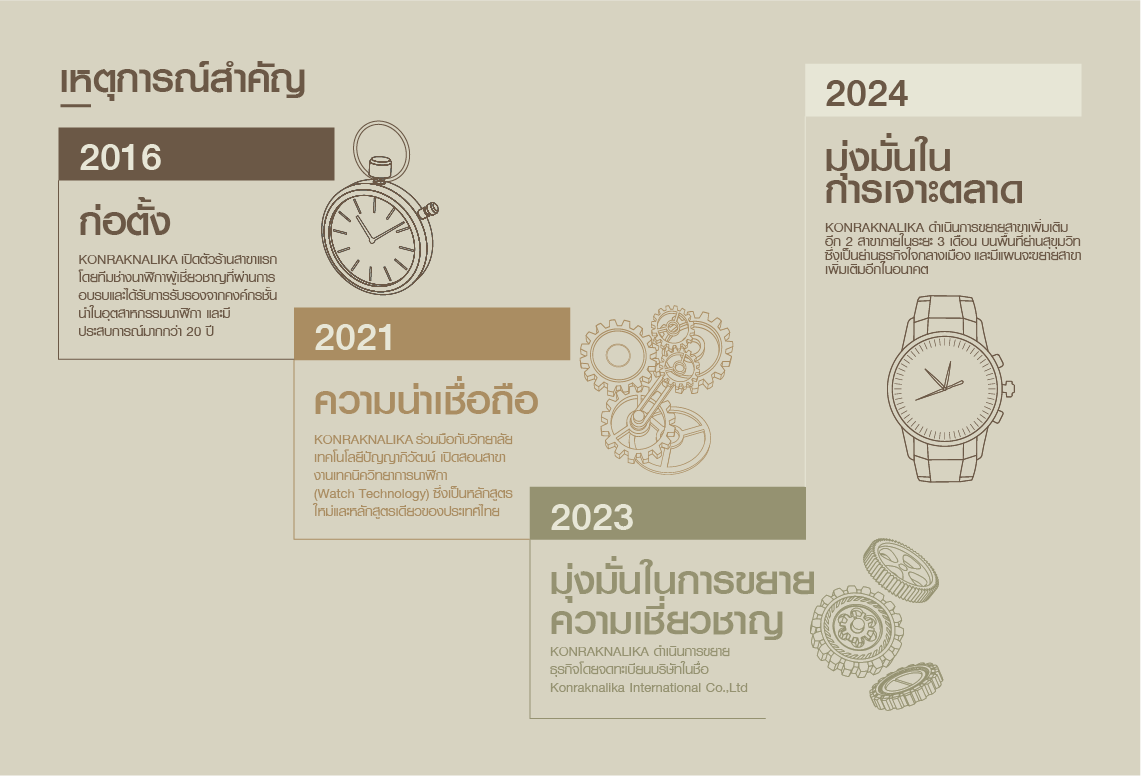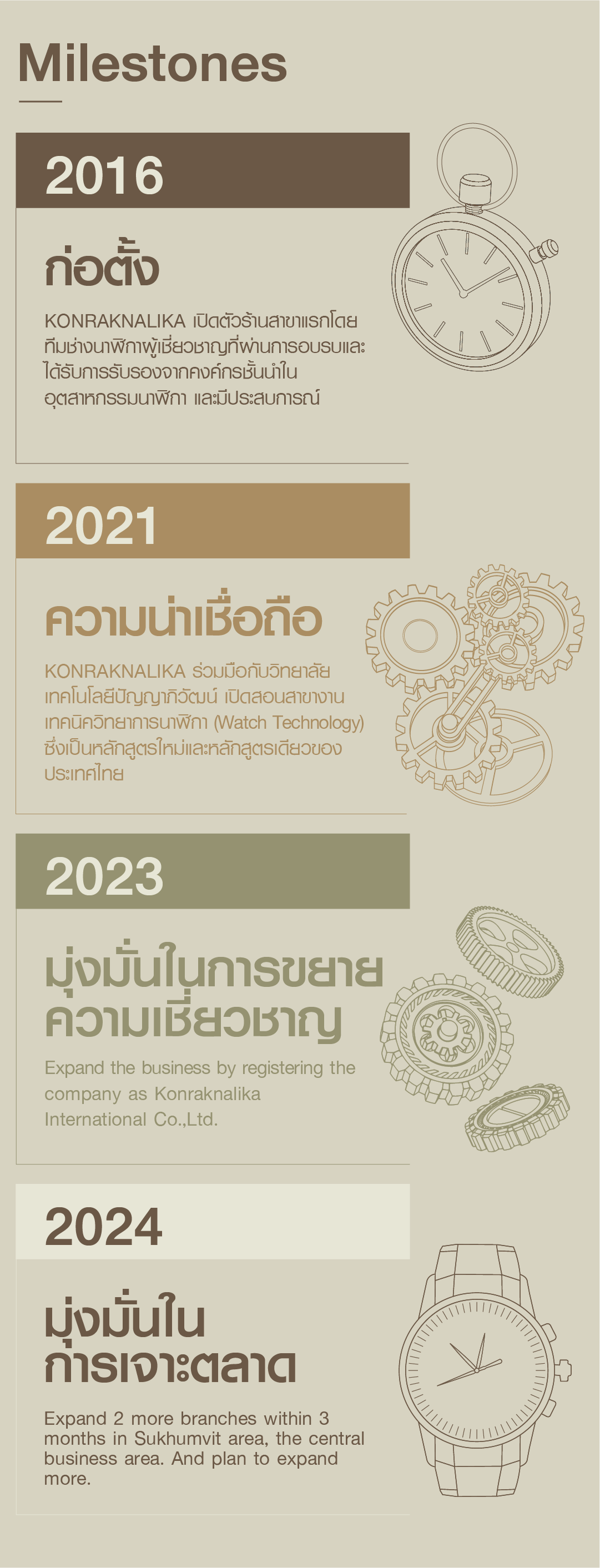 “ KONRAKNALIKA ได้เติบโตขึ้นจนกลายเป็นศูนย์ซ่อมบำรุงนาฬิกาที่มีชื่อเสียงแห่งหนึ่งในกรุงเทพฯ และได้รับความเชื่อถือทั้งจากลูกค้าทั่วไป นักสะสม รวมทั้งกลุ่มผู้ขาย ”